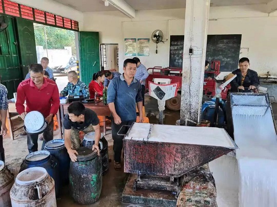 在龍江分公司雄英2隊收膠站,膠工、膠農(nóng)們紛紛前來公司收膠站賣膠水。袁國華攝