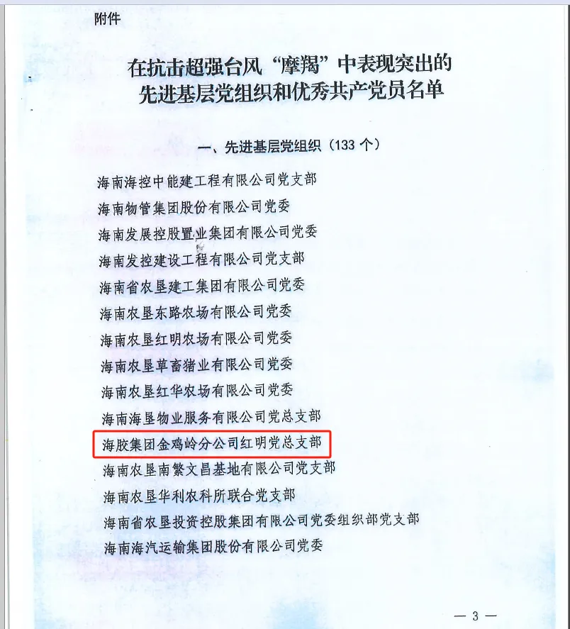 海南橡膠多個(gè)基層黨組織和黨員榮獲海墾集團(tuán)抗擊超強(qiáng)臺(tái)風(fēng)“摩羯”中表現(xiàn)突出的先進(jìn)基層黨組織和優(yōu)秀共產(chǎn)黨員榮譽(yù)稱號(hào)